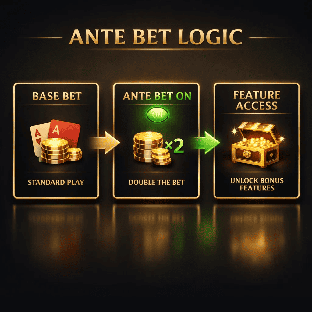 An ante bet is an optional feature that allows players to increase their base stake in exchange for access to enhanced gameplay. By activating the ante option, the cost per spin rises, but certain features become more likely or more powerful.